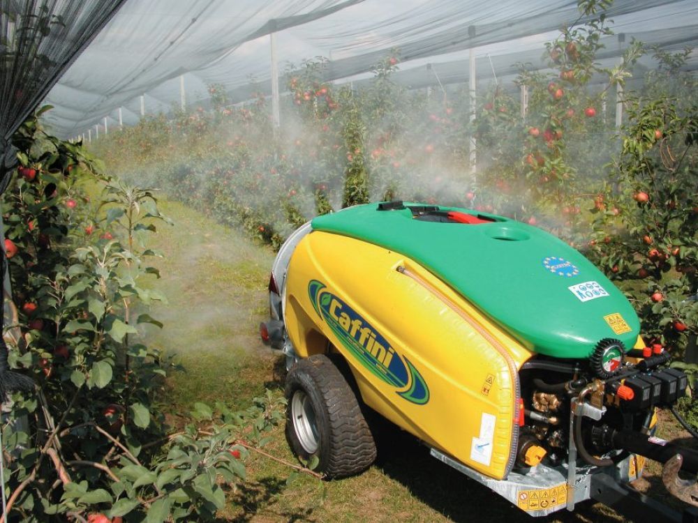 Tažený postřikovač s „kompaktními“ rozdělovači motorických ventilů „Top-Fan“ s ventilátorem s okamžitým variabilním stoupáním. Díky „reverznímu“ ventilátoru s předním sáním nenasává do ventilátoru listí, zbytky prořezávaných rostlin, ani přípravky na ochranu rostlin.